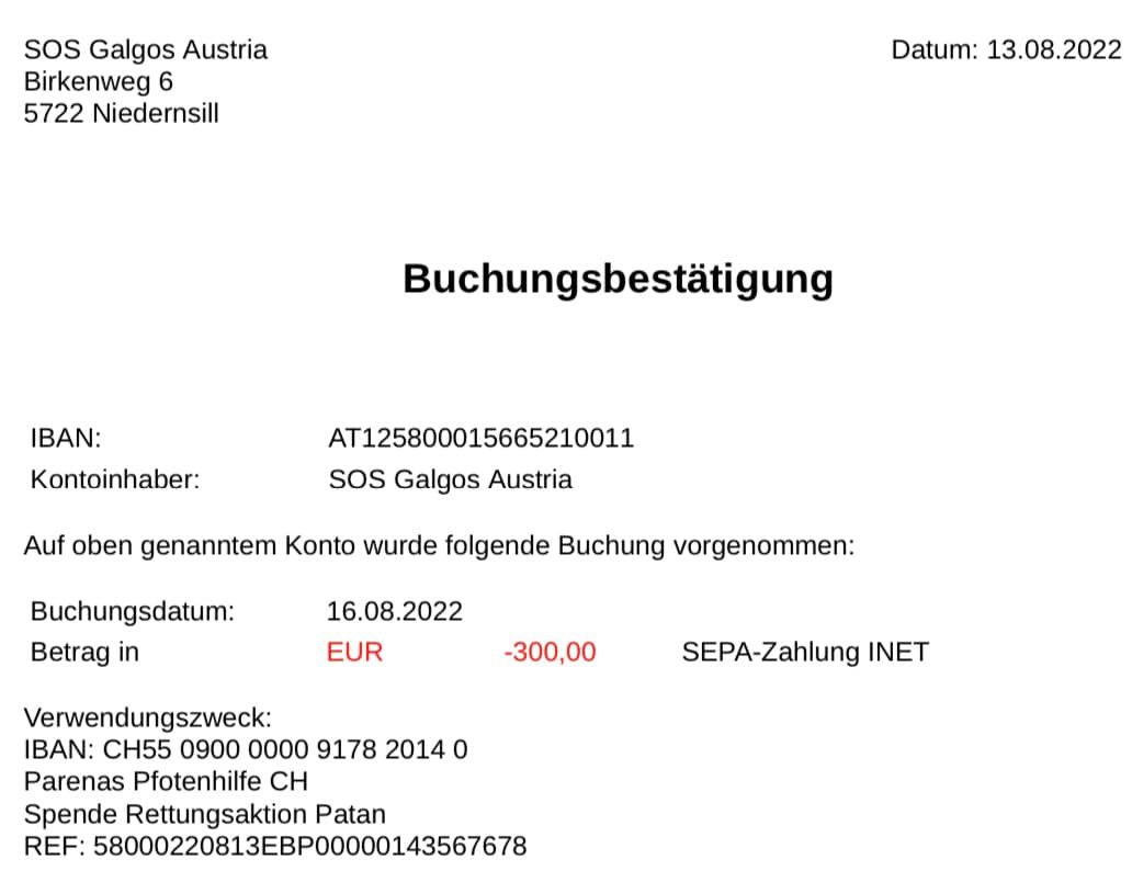 Empfänger Verein Parenas Pfotenhilfe CH